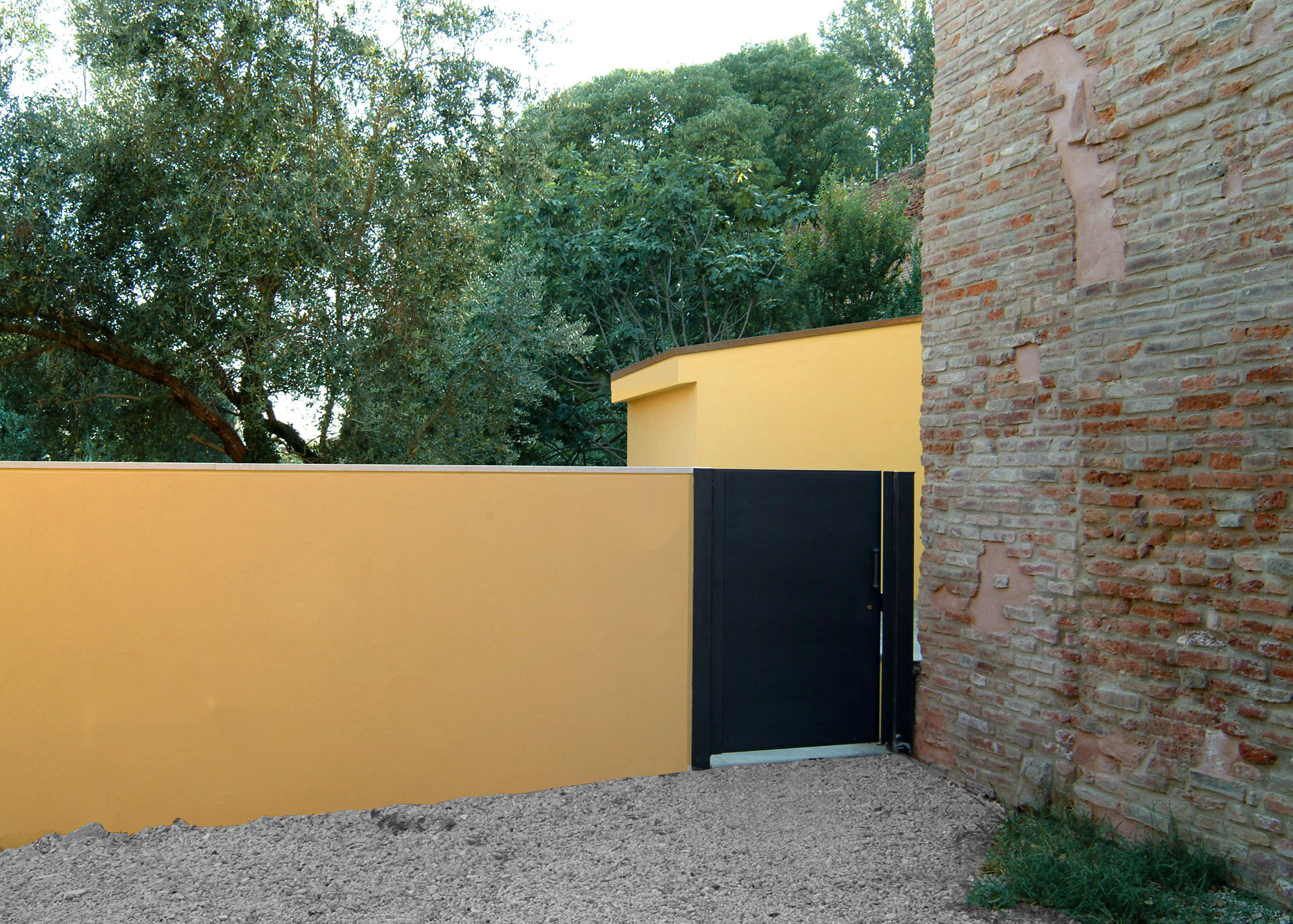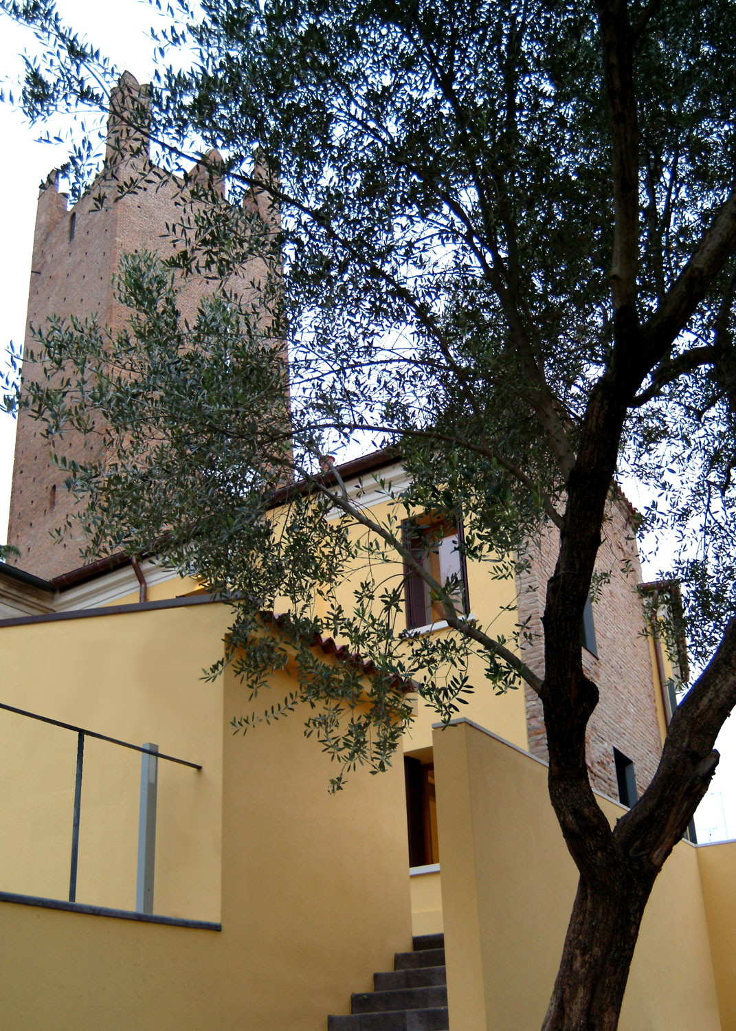 L’intervento è volto al recupero di un piccolo edificio posto a ridosso delle mura medievali della città, in grave stato di degrado, e alla sistemazione paesaggistica dell’area verde di pertinenza dello stesso. L’edificio adibito a magazzino, un tempo abitazione, viene riportato, con il progetto di ristrutturazione, alla destinazione originaria. L’immobile disposto su due piani è frutto di successive modifiche all’impianto storico originario del ‘900 su tessuto preesistente. L’intervento prevede il mantenimento della facciata in laterizio, come richiesto dalla soprintendenza ai BBA, trattata con stilatura dei giunti con malta speciale e riempimento delle lacune con coccio-pesto. Il resto del piccolo edificio viene mantenuto cercando di conferire, eliminando le superfetazioni e le incongruenze, un’immagine unitaria. Nelle finestre sul lato in facciavista vengono realizzate due imbotti in metallo per incorniciare e consolidare i bordi in laterizio. L’interno è caratterizzato dalla presenza di pochi elementi: la scala in metallo bianco con pedate in legno chiaro che passa dietro al volume essenziale del camino, il colore bianco che avvolge pareti e soffitto in legno per creare un ambiente luminoso e unitario, la pavimentazione grigio scura che contrasta con il candore delle pareti. L’area esterna sfrutta i dislivelli del terrapieno del Castello che vengono raccolti in un sistema di muri contenenti le scale di collegamento.